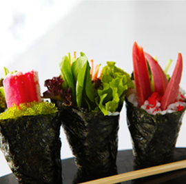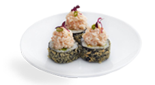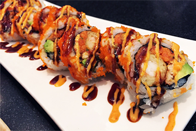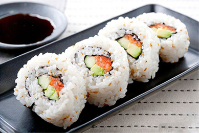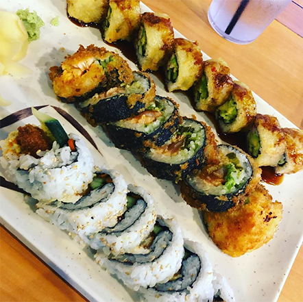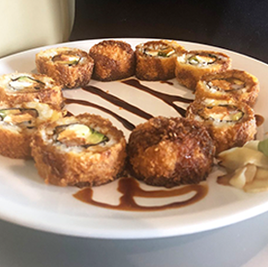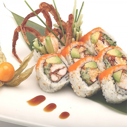 Soft-shell crab, cucumber, sprouts (or lettuce, roe, or avocado) and sometimes spicy mayo.